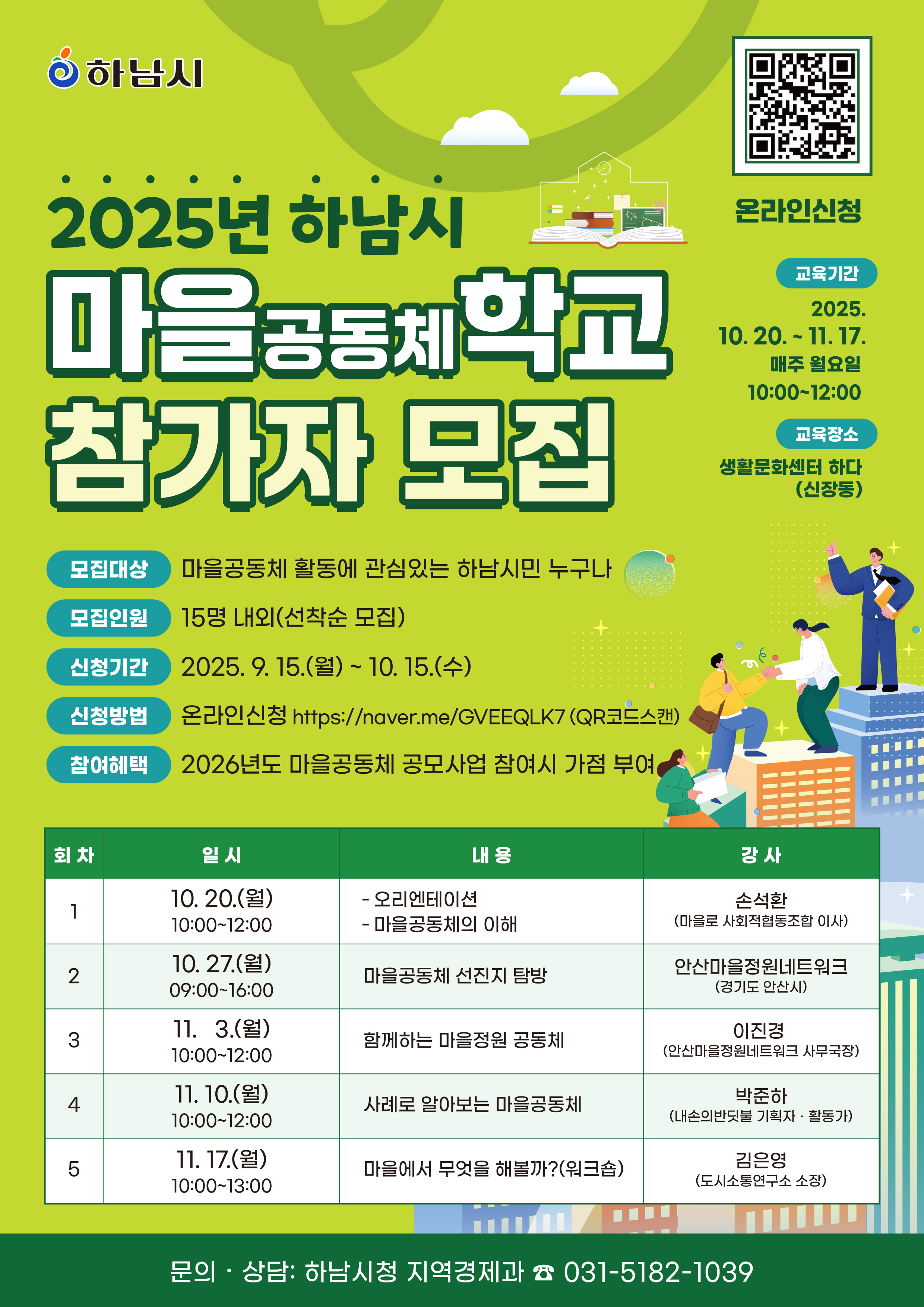 마을공동체 이론부터 현장, 워크숍까지 5회차에 걸쳐 집약적으로 마을공동체를 배울 수 있습니다. 이번 교육의 테마는 "마을정원"입니다. 마을정원을 주민들이 같이 가꾸며 공동체를 꾸려가는 현장을 안산으로 탐방갑니다. 마을활동에 관심있는 분의 많은 관심과 참여 바랍니다. ○ 교육명: 2025년 하남시 마을공동체 학교 ○ 모집대상: 마을활동에 관심있는 하남시민 15명 내외 ○ 교육기간: 10.20.(월)~11.17.(월) 10:00~12:00(매주 월요일) ○ 교육장소: 생활문화센터 하다(하남시청 옆) ○ 교육내용: 마을공동체 이해 및 사례, 선진지 탐방 등 ○ 신청기간: 9.15.(월)~10.15.(수)(선착순 모집) ○ 신청방법: 온라인 신청(https://naver.me/GVEEQLK7)포스터의 QR코드 스캔 ○ 참가혜택: ’26년 마을공동체 공모사업 참여시 가점 ○ 문의사항: 지역경제과 ☏031-5182-1039 |