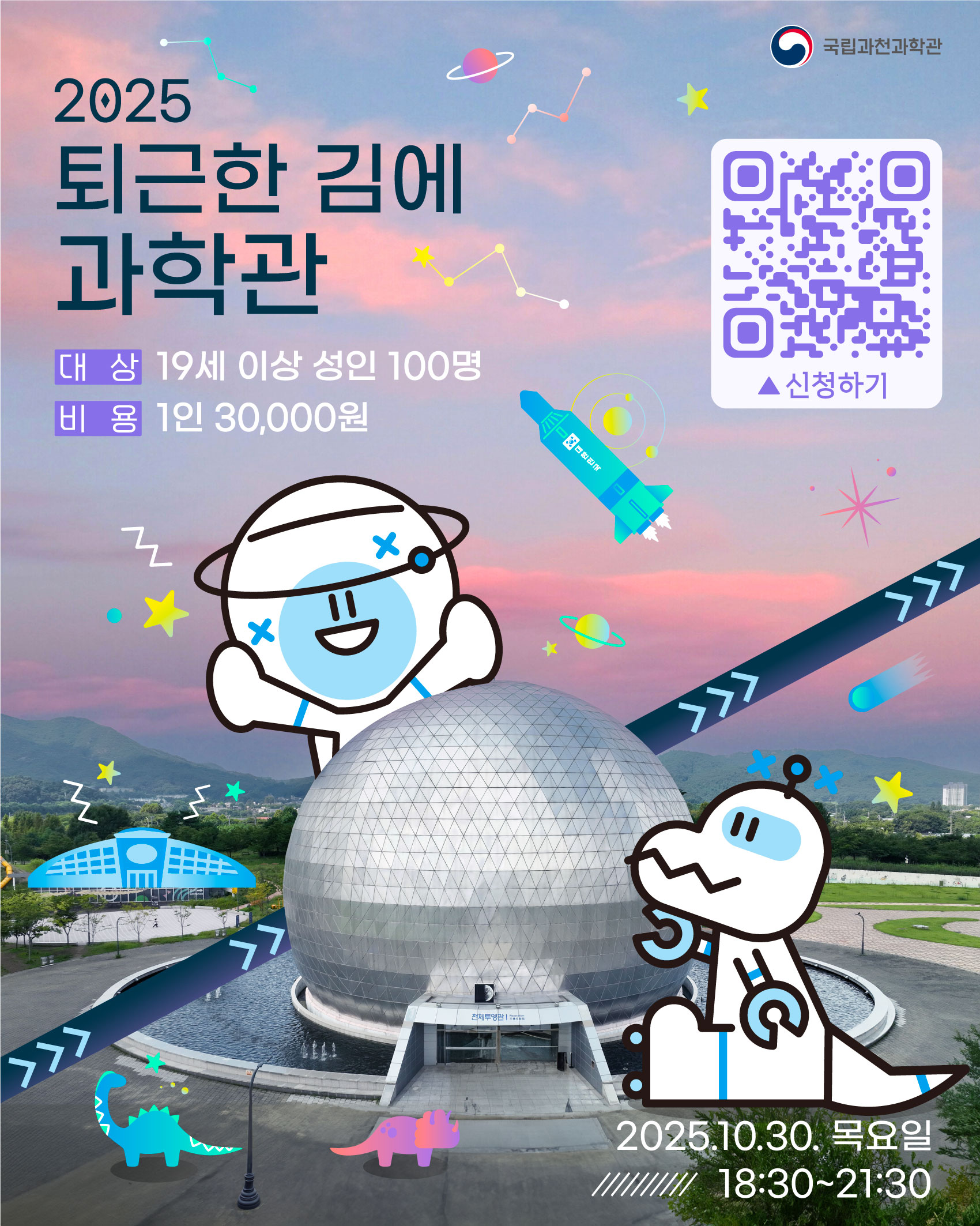 「2025 퇴근한 김에 과학관」행사 개요 ㅇ (일시) 10. 30.(목) 18:30 ~ 21:30 ㅇ (장소) 국립과천과학관(경기 과천시 상하벌로 110) ㅇ (대상) 성인 100명 ㅇ (참가비) 인당 30,000원 ㅇ (내용) 전시 큐레이션(수억 년의 뇌 vs 70년의 인공지능), 과학연극(외계공작소-발사 6개월 전), 케이터링, 힐링 스페이스(국내 최대 돔 영상관 별자리 해설) ㅇ (예약) https://event-us.kr/spielen/event/101525 또는 포스터 내 QR 접속 |