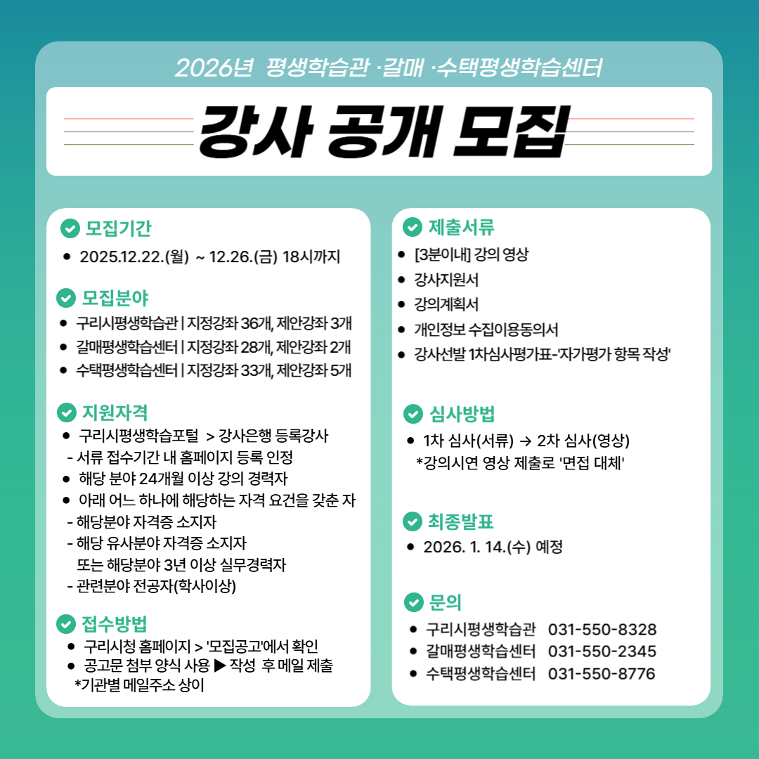 구리시 평생학습관·평생학습센터에서 2026년도 평생교육 프로그램 강사를 모집한다고 하오니, 많은 관심 부탁드립니다. □ 모집 개요 가. 접수기간 : 2025. 12. 22.(월) ~ 12. 26.(금) (4일간) 18:00까지 나. 모집분야 ※ 기관별 모집분야 상이 ① 구리시평생학습관 : 지정(36개)/제안(3개) ② 갈매평생학습센터 : 지정(28개)/제안(2개) ③ 수택평생학습센터 : 지정(33개)/제안(5개) 다. 접수방법 : 이메일 접수 ※ 자세한 사항은 구리시청 홈페이지(http://www.guri.go.kr) 모집공고 참고 라. 문 의 처 ① 구리시평생학습관 (☎ 031-550-8328) ② 갈매평생학습센터 (☎ 031-550-2345) ③ 수택평생학습센터 (☎ 031-550-8776) |