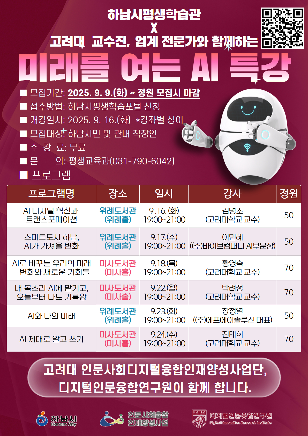 ● 접수기간: 2025. 9. 9.(화) 9시부터 선착순 접수 ● 개강일시: 2025. 9. 16.(화) ~ 강좌별 개강일 상이 ● 교육대상: 하남시민 및 관내 직장인 ● 접수방법: 하남시평생학습포털 홈페이지 온라인 접수 ● 수 강 료 : 무료 (교재비, 재료비 등 개인부담) ● 장 소: 위례도서관 / 미사도서관 ● 문 의: 평생교육과 (031-790-6042, 6009) ※ 강좌별 수강 장소 및 시간을 꼭 확인하시기 바랍니다