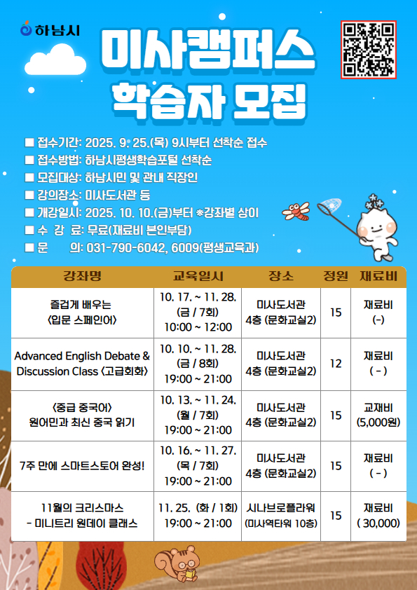 [학습자모집] 2025년 하남시평생학습관「미사캠퍼스」 10~11월 학습자 모집 (9/25부터 선착순 접수)