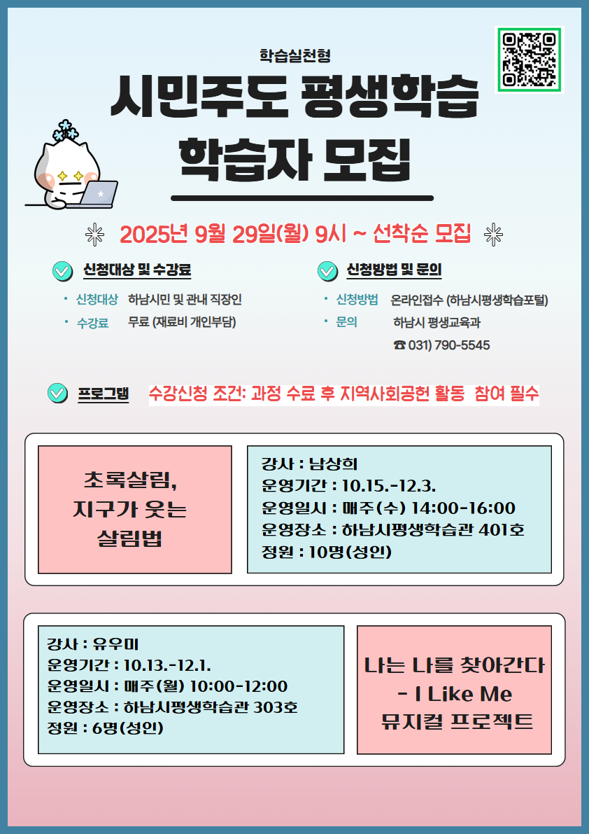 ✦ 시민이 직접 기획한 학습과정에 참여할 학습자를 모집합니다! 본 프로그램은 시민 제안으로 시작된 뜻깊은 학습과정으로, 교육 종료 후에는 지역사회 공헌활동이 함께 이루어지는 실천형 평생학습 프로그램입니다. 배움을 행동으로 이어가며, 지역에 긍정적인 변화를 만들어가는 여정에 여러분의 소중한 참여를 기다립니다! ● 초록살림, 지구가 웃는 살림법 ☞ 수강신청 ● 나는 나를 찾아간다 - I Like Me 뮤지컬 프로젝트 ☞ 수강신청 ![]() ● 교육기간 : 2025. 10. 13.~ 강좌별 개강일, 종강일 상이 ● 교육대상 : 하남시민 및 관내 직장인 ● 접수기간 : 2025. 9. 29.(월) 9시 ~ 선착순 접수 ● 접수방법 : 온라인 선착순 접수 (하남시평생학습포털) ● 운영장소 : 하남시평생학습관 ● 수강료 : 무료 (재료비 개인부담) ● 문의: 하남시 평생교육과 (☏ 031-790-5545) |