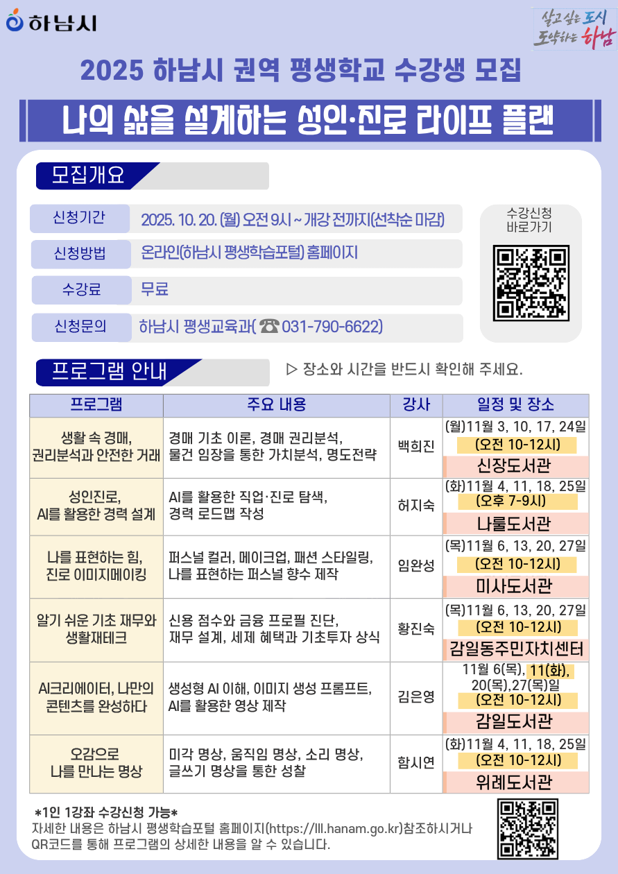 2025 하남시 [권역 평생학교]에 참여하실 학습자를 모집합니다! <신청개요> ○ 접수기간 : 2025. 10. 20.(월) 오전 9시 ~ 선착순 접수 ○ 접수방법 : 온라인 접수(하남시평생학습포털-평생학습관) <교육개요> ○ 교육목적 : 나의 삶을 설계하는 성인·진로 라이프 플랜을 위한 다양한 학습경험 제공 ○ 교육기간 : 2025. 11. 3.(월)~ 11. 27.(목) / 권역별 주제 상이 ○ 교육대상 : 하남시민 및 직장인 등 성인 ○ 운영장소 : 권역별 장소(신장도서관, 나룰도서관, 미사도서관, 위례도서관, 감일도서관, 감일동주민자치센터) ○ 수 강 료 : 무료(1인 1강좌 ) ○ 문 의: 하남시 평생교육과(031-790-6622) ⚫ <신장권역 : 생활속 경매 권리분석과 안전한 거래> 수강신청 바로가기 ⚫ <덕풍권역 : 성인진로 AI를 활용한 경력 설계> 수강신청 바로가기 ⚫ <미사권역 : 나를 표현하는 힘 진로 이미지메이킹> 수강신청 바로가기 ⚫ <감일권역 : 알기 쉬운 기초 재무와 생활재테크> 수강신청 바로가기 ⚫ <감일권역 : AI크리에이터 나만의 콘텐츠를 완성하다> 수강신청 바로가기 ⚫ <위례권역 : 오감으로 나를 만나는 명상> 수강신청 바로가기