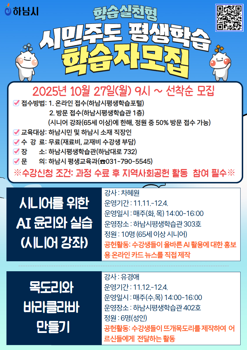 ![]() ● 교육기간 : 2025. 11. 11.(화) ~ 12. 4.(목) (강좌별 개강일 상이) ● 교육대상 : 하남시민 및 하남시 소재 직장인 (시니어 강좌 65세 이상) ● 접수기간 : 2025. 10. 27.(월) 9시 ~ 선착순 접수 ● 접수방법 : 1. 온라인 접수 (하남시평생학습포털) 2. 방문 접수 (하남시평생학습관 1층) (시니어 강좌(65세 이상)에 한해, 정원 중 50% 방문 접수 가능) ● 운영장소 : 하남시평생학습관 ● 수강료 : 무료 (재료비 개인부담) ● 문의: 하남시 평생교육과 (☏ 031-790-5545) |