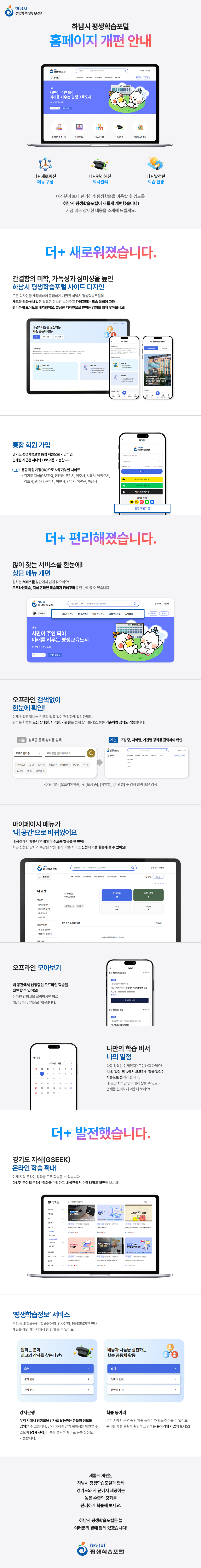 안녕하세요. 하남시 평생학습포털이 2026년 1월부터 새로운 홈페이지로 개편됩니다. 신규 홈페이지 주소, 회원가입 방법 등 자세한 사항은 추후 공지사항을 통해 안내드리도록 하겠습니다. 감사합니다.