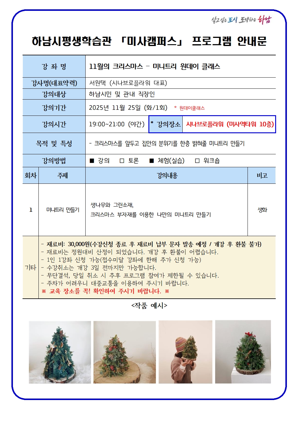 ※ 재료비 납부 관련 문자는 수강신청 종료 후 일괄 발송 예정이며, 재료비 납부 확인 후 최종 접수 완료됩니다. (개강 후 환불 불가) - 1인 1강좌까지 수강신청 가능하며 수강인원 미달강좌에 한해 추가신청 가능합니다. - 중도 포기, 3회 연속 무단결석 시 자동 취소 처리되며, 이후 수강신청이 제한 됩니다. - 강의내용은 현장상황에 따라 변경될 수 있습니다. - 교재비 및 재료비, 자격증 발급 비용은 개인부담입니다. - 주차장이 협소하므로 대중교통을 이용하여 주시기 바랍니다. ※ 2025년 미사캠퍼스 강좌별 장소 및 시간을 꼭! 확인하시기 바랍니다. |