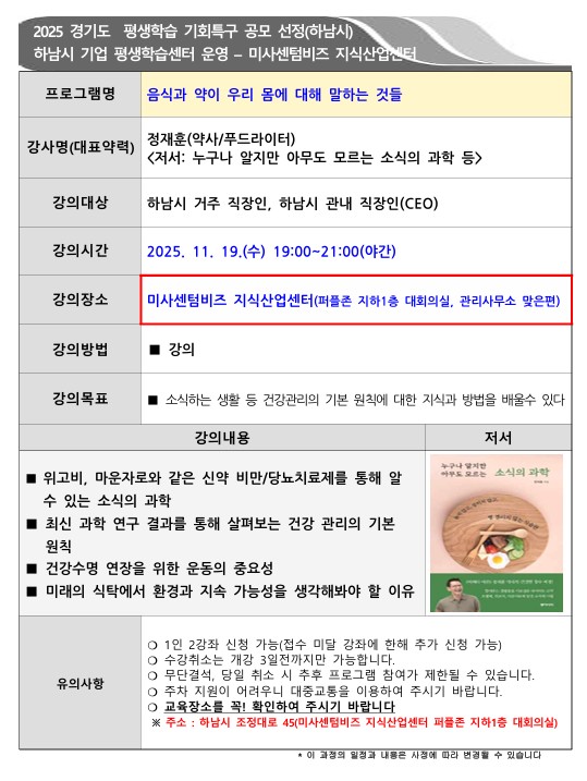 2025년 경기도 평생학습 기회특구 공모선정(하남시) 직장 업무 등으로 평생교육 참여에 제약이 있는 직장인들의 평생학습 기회를 확대하고자 야간에 진행되는 프로그램입니다. 미사센텀비즈 지식산업센터와 아이테코 지식산업센터와 협력하여 <하남시 기업 평생학습센터>를 운영합니다. ○운영장소 : 미사센텀비즈 지식산업센터, 아이테코 지식산업센터 내 교육장 ○신청대상 : 하남시 거주 및 관내 직장인 등 ※ 수강 신청 시 이름(직장명) 기재 ○신청문의 : 031-790-6622