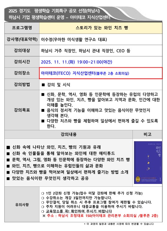 2025년 경기도 평생학습 기회특구 공모선정(하남시) 직장 업무 등으로 평생교육 참여에 제약이 있는 직장인들의 평생학습 기회를 확대하고자 야간에 진행되는 프로그램입니다. 미사센텀비즈 지식산업센터와 아이테코 지식산업센터와 협력하여 <하남시 기업 평생학습센터>를 운영합니다. ○운영장소 : 미사센텀비즈 지식산업센터, 아이테코 지식산업센터 내 교육장 ○신청대상 : 하남시 거주 및 관내 직장인 등 ○신청시 : 수강생 이름+직장명 기재 ○신청문의 : 031-790-6622