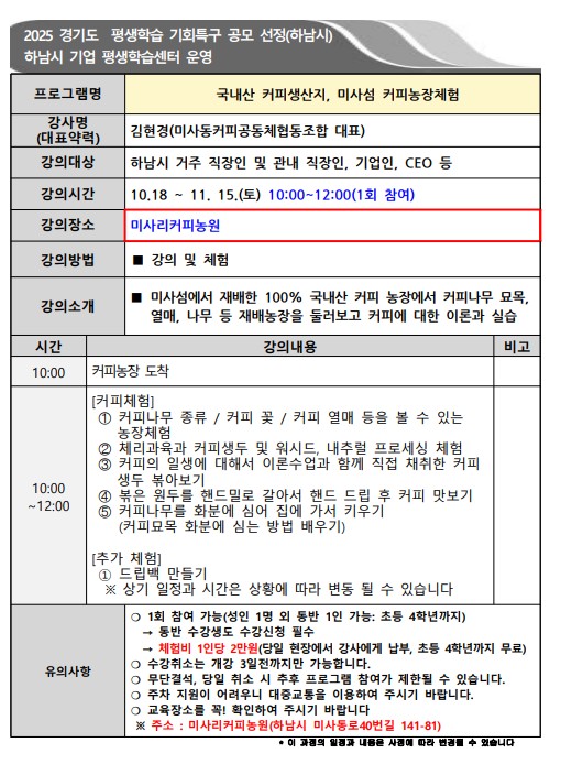 2025년 경기도 평생학습 기회특구 공모선정(하남시) 직장 업무 등으로 평생교육 참여에 제약이 있는 직장인들의 평생학습 기회를 확대하고자 진행되는 프로그램입니다. ○운영장소 : 미사리커피농원(하남시 미사동로40번길 141-81) ○신청대상 : 하남시 거주 및 관내 직장인 등 ❍ 1회 참여 가능(성인 1명 외 동반 1인 가능: 초등 4학년까지) → 동반 수강생도 수강신청 필수 → 체험비 1인당 2만원(당일 현장에서 강사에게 납부, 초등 4학년까지 무료) ○신청시 : 수강생 이름+직장명 기재 ○신청문의 : 031-790-6622