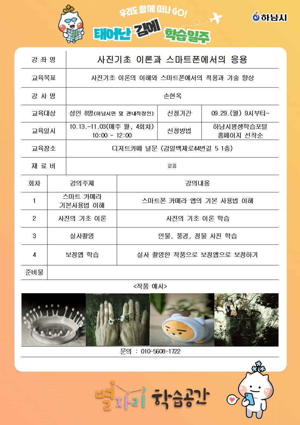 ※ 1인 2개 강좌 수강 신청 가능하며, 신청강좌가 2개 초과시 임의로 취소 될 수 있습니다. - 중도포기, 무단결석 시 자동 취소되며, 이후 수강신청이 제한될 수 있습니다. ※ 수업 관련 내용은 담당매니저가 안내합니다.(장소, 시간, 재료비 납부 방법 등) 수업진행은 카카오톡 오픈톡방이 개설되어 안내가 진행됩니다. ※ 주차가능합니다. |
