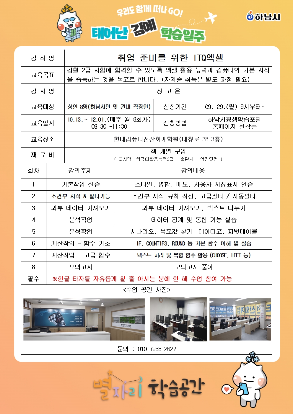 ※자격증 취득까지는 별도의 추가 과정이 필요합니다.(유료) ※한글 타자를 자유롭게 칠 줄 아시는 분에 한 해 수업 참여 가능합니다. ※ 1인 2개 강좌 수강 신청 가능하며, 신청강좌가 2개 초과시 임의로 취소 될 수 있습니다. - 중도포기, 무단결석 시 자동 취소되며, 이후 수강신청이 제한될 수 있습니다. ※ 수업 관련 내용은 담당매니저가 안내합니다.(장소, 시간, 재료비 납부 방법 등) 수업진행은 카카오톡 오픈톡방이 개설되어 안내가 진행됩니다. ※별도의 주차장이 없습니다.도보 또는 대중교통을 이용해주시기 바랍니다.