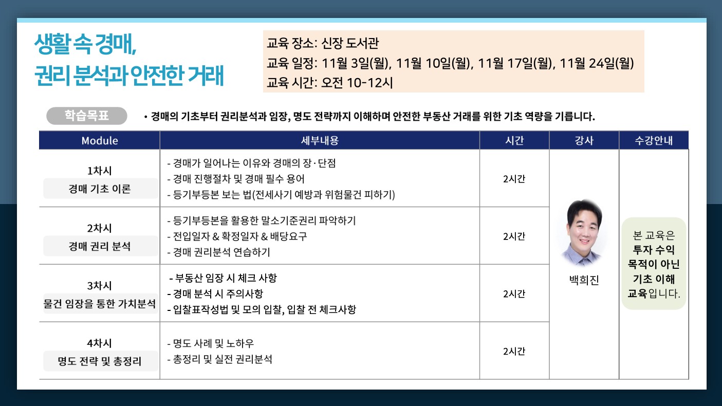 [2025 신장권역 평생학교] ● 강좌목표 : 경매의 기초부터 권리분석과 임장, 명도 전략까지 이해하며 안전한 부동산 거래를 위한 기초 역량을 기른다. ● 운영기간 : 2025.11.3.- 11. 24. 매주(월) 10:00-12:00 (총 4회) ● 운영장소 : 신장도서관(지하1층 강당) ● 수 강 료 : 무료