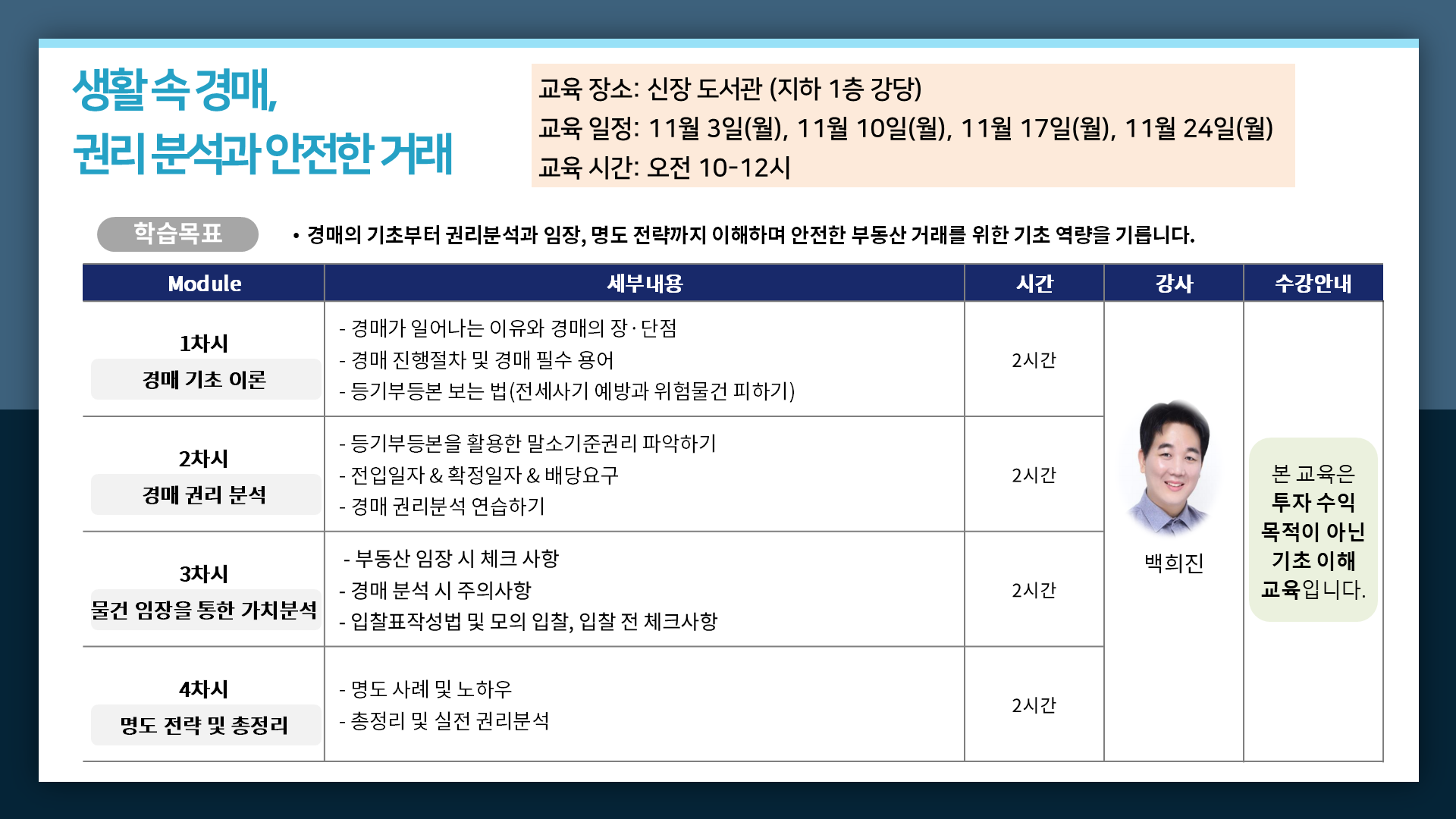 [2025 신장권역 평생학교] ● 강좌목표 : 경매의 기초부터 권리분석과 임장, 명도 전략까지 이해하며 안전한 부동산 거래를 위한 기초 역량을 기른다. ● 운영기간 : 2025.11.3.- 11. 24. 매주(월) 10:00-12:00 (총 4회) ● 운영장소 : 신장도서관(지하1층 강당) ● 수 강 료 : 무료