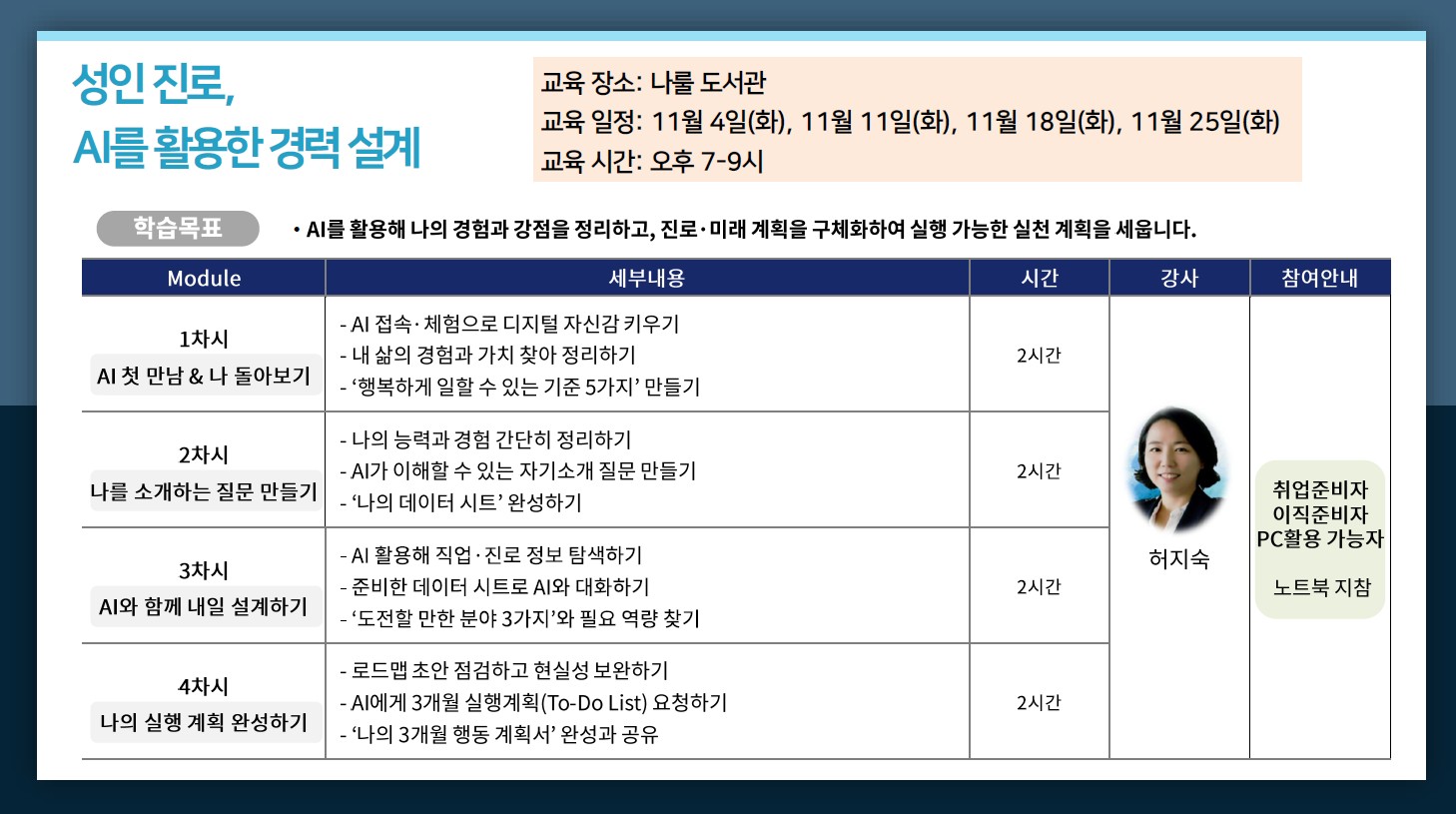 [2025 덕풍권역 평생학교] ● 강좌목표 : AI를 활용해 나의 경험과 강점을 정리하고, 진로.미래 계획을 구체화하여 실행 가능한 실천계획을 세운다. ● 운영기간 : 2025.11.4.- 11. 25. 매주(화) (야간) 19:00-21:00 (총 4회) ● 운영장소 : 나룰도서관(1층 문화교실) ● 수 강 료 : 무료