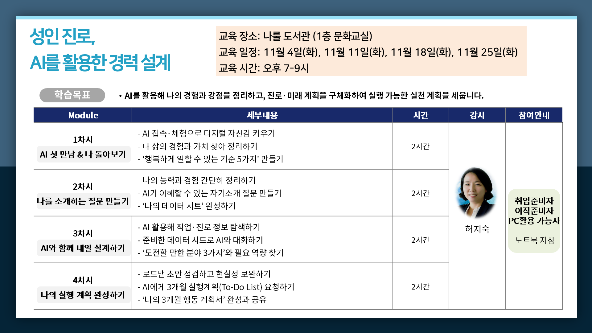 [2025 덕풍권역 평생학교] ● 강좌목표 : AI를 활용해 나의 경험과 강점을 정리하고, 진로.미래 계획을 구체화하여 실행 가능한 실천계획을 세운다. ● 운영기간 : 2025.11.4.- 11. 25. 매주(화) (야간) 19:00-21:00 (총 4회) ● 운영장소 : 나룰도서관(1층 문화교실) ● 수 강 료 : 무료