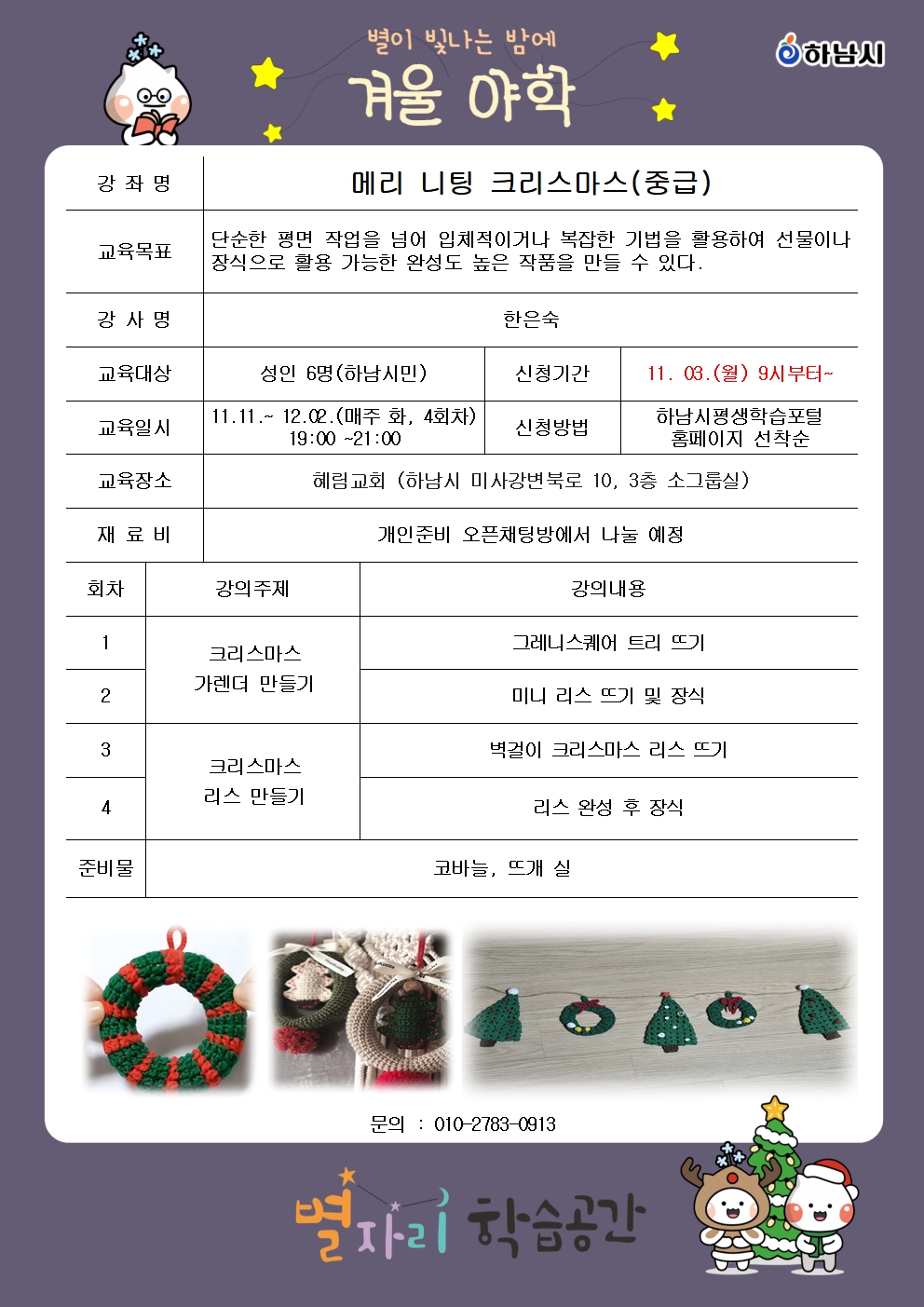 ※매직링,짧은뜨기,긴뜨기 기본 뜨기가 가능하신 학습자 중급과정입니다. ※1인 2개강좌수강 신청 가능하며, 신청강좌가2개 초과시 임의로 취소 될 수 있습니다. - 중도포기,무단결석 시 자동 취소되며,이후 수강신청이 제한될 수 있습니다. ※수업 관련 내용은 담당매니저가 안내합니다.(장소,시간,재료비 납부 방법 등) ※수업진행은카카오톡 오픈톡방이 개설되어 재료구입과 수업에 대한 안내가 진행됩니다. ※주차가 가능합니다. |
