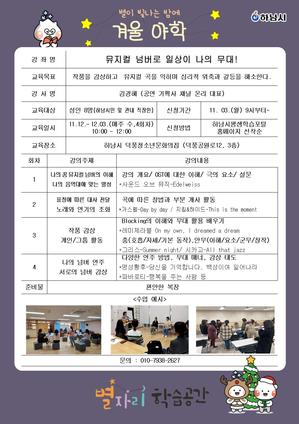 ※ 1인 2개 강좌 수강 신청 가능하며, 신청 강좌가 2개 초과 시 임의로 취소 될 수 있습니다. - 중도 포기, 무단 결석 시 자동 취소되며, 이후 수강 신청이 제한될 수 있습니다. ※ 수업 관련 내용은 담당 매니저가 안내드립니다.(장소, 시간, 재료비 납부 방법 등) 수업 진행은 카카오톡 오픈톡방이 개설되어 안내가 진행됩니다. ※별도의 주차장은 없습니다. 도보나 대중교통을 이용해주시기 바랍니다. |