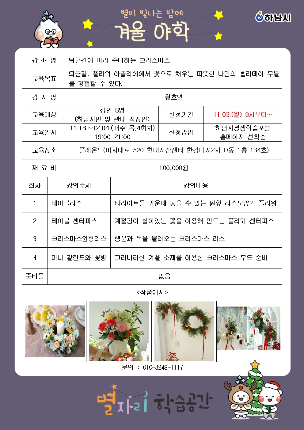 ※ 1인 2개 강좌 수강 신청 가능하며, 신청강좌가 2개 초과시 임의로 취소 될 수 있습니다. - 중도포기, 무단결석 시 자동 취소되며, 이후 수강신청이 제한될 수 있습니다. ※ 수업 관련 내용은 담당매니저가 안내합니다.(장소, 시간, 재료비 납부 방법 등) 수업진행은 카카오톡 오픈톡방이 개설되어 안내가 진행됩니다. |