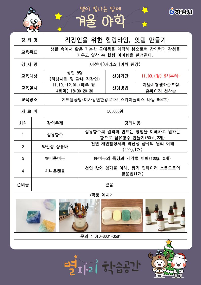 ※ 1인 2개 강좌 수강 신청 가능하며, 신청강좌가 2개 초과시 임의로 취소 될 수 있습니다. - 중도포기, 무단결석 시 자동 취소되며, 이후 수강신청이 제한될 수 있습니다. ※ 수업 관련 내용은 담당매니저가 안내합니다.(장소, 시간, 재료비 납부 방법 등) 수업진행은 카카오톡 오픈톡방이 개설되어 안내가 진행됩니다. |