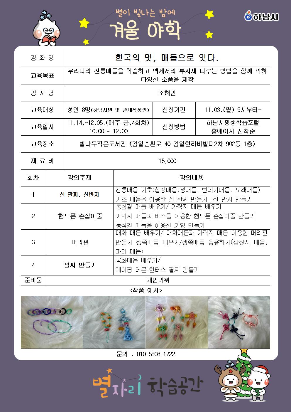 ※ 1인 2개 강좌 수강 신청 가능하며, 신청 강좌가 2개 초과 시 임의로 취소 될 수 있습니다. - 중도 포기, 무단 결석 시 자동 취소되며, 이후 수강 신청이 제한될 수 있습니다. ※ 수업 관련 내용은 담당 매니저가 안내드립니다.(장소, 시간, 재료비 납부 방법 등) 수업 진행은 카카오톡 오픈톡방이 개설되어 안내가 진행됩니다. ※ 주차가능합니다. |
