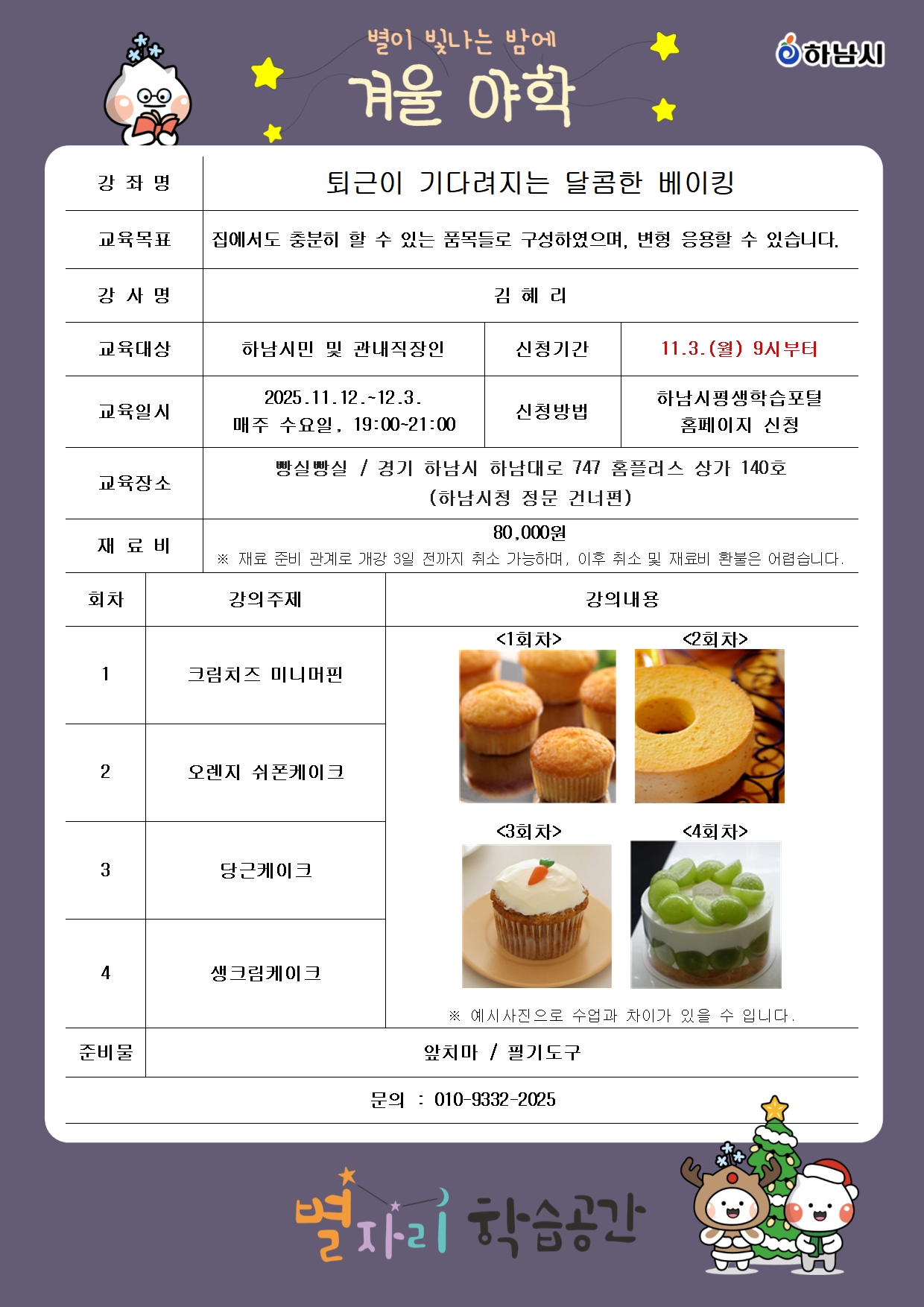 ※ 1인 2개 강좌 수강 신청 가능하며, 신청강좌가 2개 초과시 임의로 취소 될 수 있습니다. - 중도포기, 무단결석 시 자동 취소되며, 이후 수강신청이 제한될 수 있습니다. ※ 수업 관련 내용은 담당매니저가 문자로 안내합니다.(장소, 시간, 재료비 납부 방법 등) ※ 개강 전 카카오톡 오픈톡방이 개설되어 수업안내가 진행됩니다. ※ 주차 3시간 무료입니다. ※ 7월 수업에서 제일 인기가 좋았던 당근케이크! 이번에도 진행합니다! |
