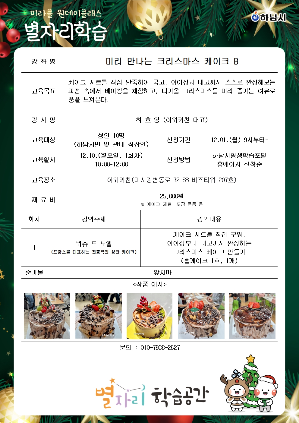 ※ 1인 2개 강좌 수강 신청 가능하며, 신청강좌가 2개 초과시 임의로 취소 될 수 있습니다. ※ 수업 관련 내용은 담당매니저가 안내합니다.(장소, 시간, 재료비 납부 방법 등) |