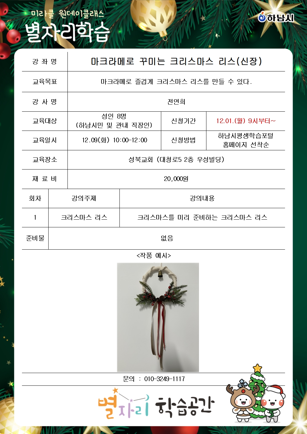 ※ 1인 2개 강좌 수강 신청 가능하며, 신청 강좌가 2개 초과 시 임의로 취소될 수 있습니다. - 중도 포기, 무단결석 시 자동 취소되며, 이후 수강 신청이 제한될 수 있습니다. ※ 수업 관련 내용은 담당 매니저가 안내드립니다. (장소, 시간, 재료비 납부 방법 등) 수업 진행은 카카오톡 오픈톡방이 개설되어 안내가 진행됩니다. ※ 주차 불가합니다. |