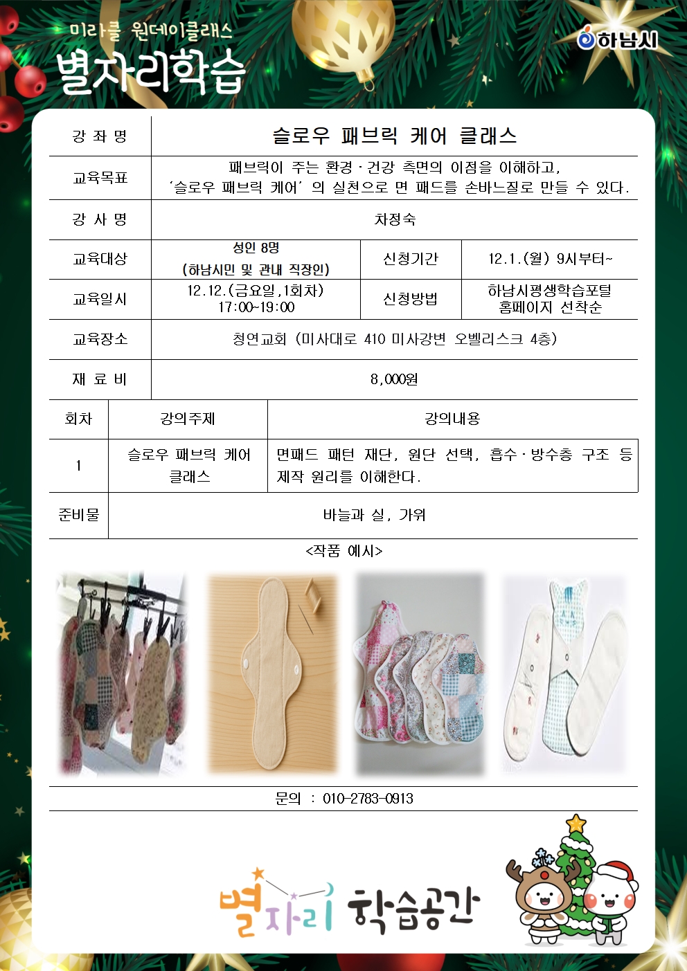 ※ 1인 2개 강좌 수강 신청 가능하며, 신청강좌가 2개 초과시 임의로 취소 될 수 있습니다. - 중도포기, 무단결석 시 자동 취소되며, 이후 수강신청이 제한될 수 있습니다. ※ 수업 관련 내용은 담당매니저가 문자로 안내합니다.(장소, 시간, 재료비 납부 방법 등) ※ 주차 3시간 무료입니다. |